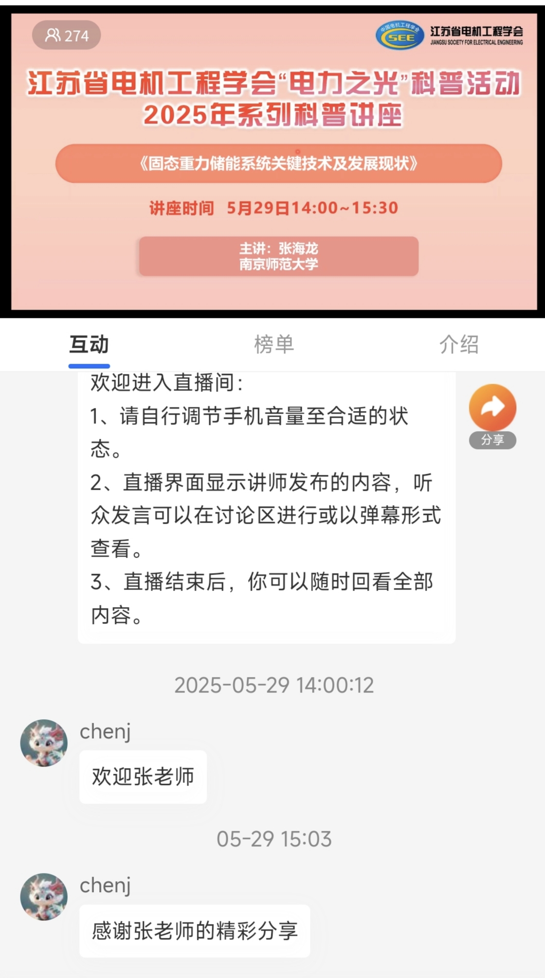 5月29日下午,江苏省电机工程学会成功举办2025年“全国科技活动周”科普讲座。讲座邀请南京师范大学电气与自动化工程学院的张海龙副教授作《固态重力储能系统关键技术及发展现状》科普讲座。省电机工程学会各会员单位、专工委会、学生分会以及国内有关核电能源企业相关专业人员270余人次在线观看了本次讲座。