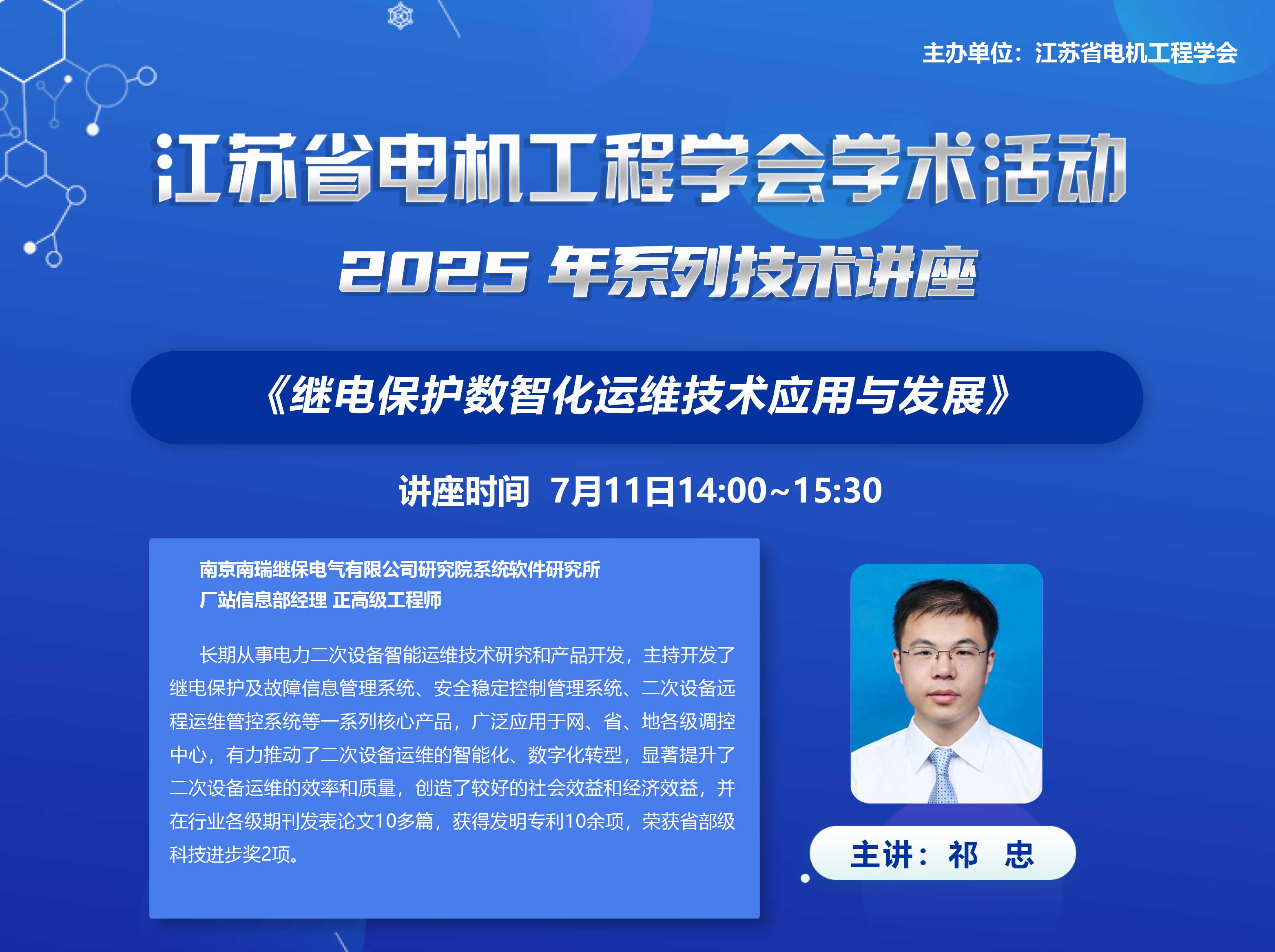 7月11日下午,省电机工程学会举办2025年第13期线上讲座。讲座邀请南京南瑞继保电气有限公司研究院系统软件研究所厂站信息部经理祁忠正高级工程师作《继电保护数智化运维技术应用与发展》报告。省电机工程学会各会员单位、专工委会、学生分会以及省内有关电力能源企业相关专业人员110余人次在线观看了本次培训。