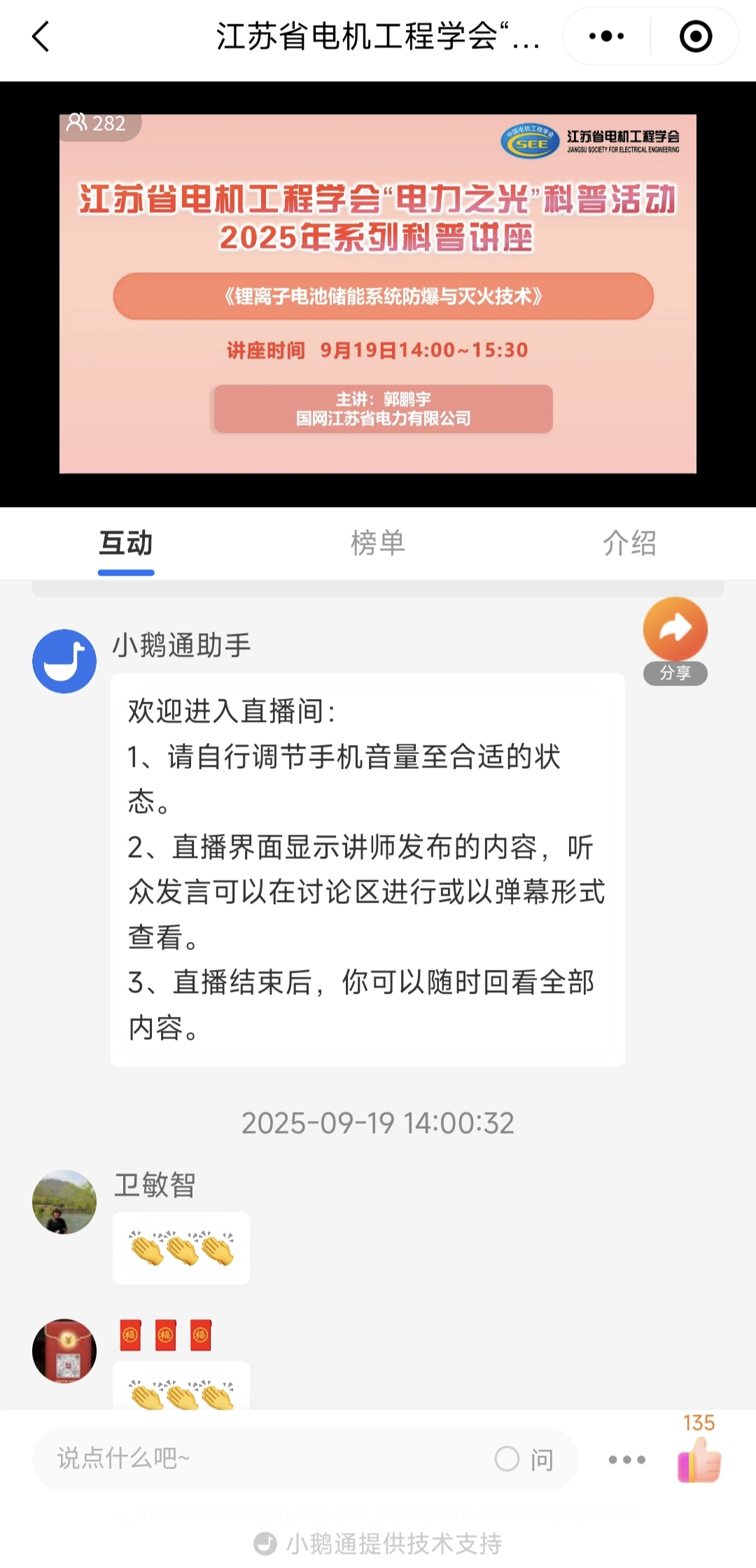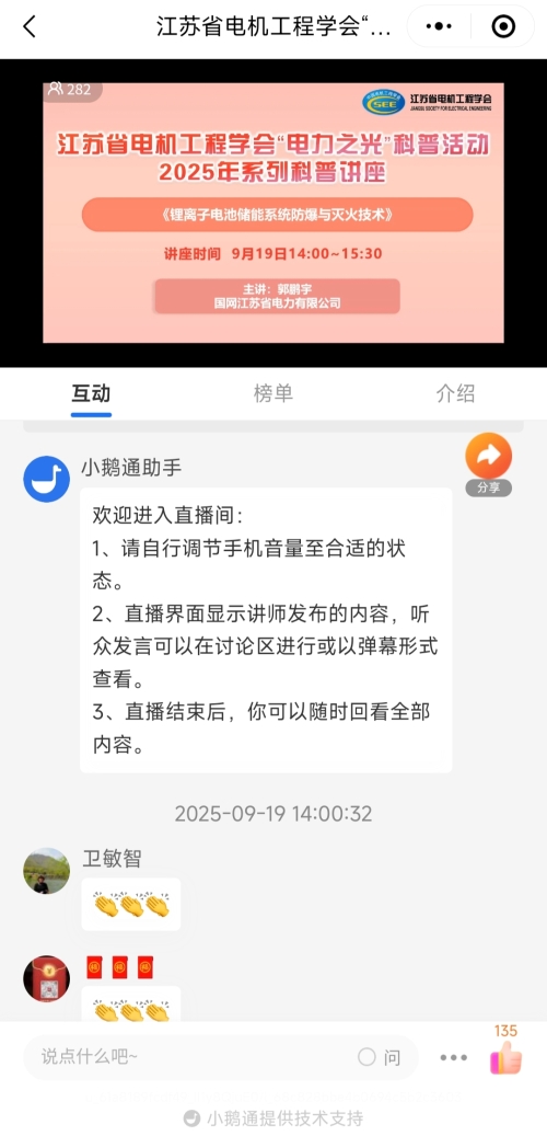 9月19日下午,正值“全国科普月”之际,省电机工程学会成功举办2025年第十九期线上讲座。讲座邀请安全技术专委会专家郭鹏宇高工作《锂离子电池储能系统防爆与灭火技术》报告。省电机工程学会各会员单位、专工委会、学生分会以及省内相关电力能源企业专业人员280余人次在线观看了本次讲座。