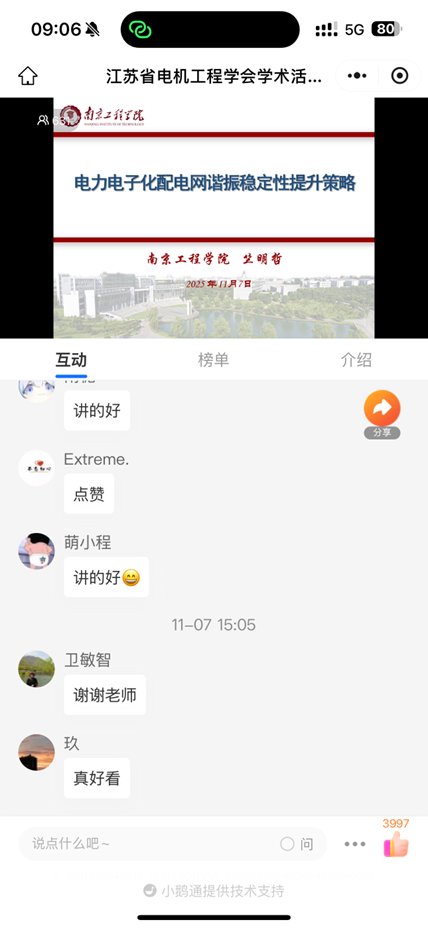 11月7日下午,省电机工程学会成功举办2025年第二十三期线上讲座。讲座邀请南京工程学院竺明哲博士作《电力电子化配电网谐振稳定性提升策略》技术讲座。省电机工程学会各会员单位、专工委会、学生分会以及省内外电力能源企业相关专业人员630余人在线观看了本次讲座。