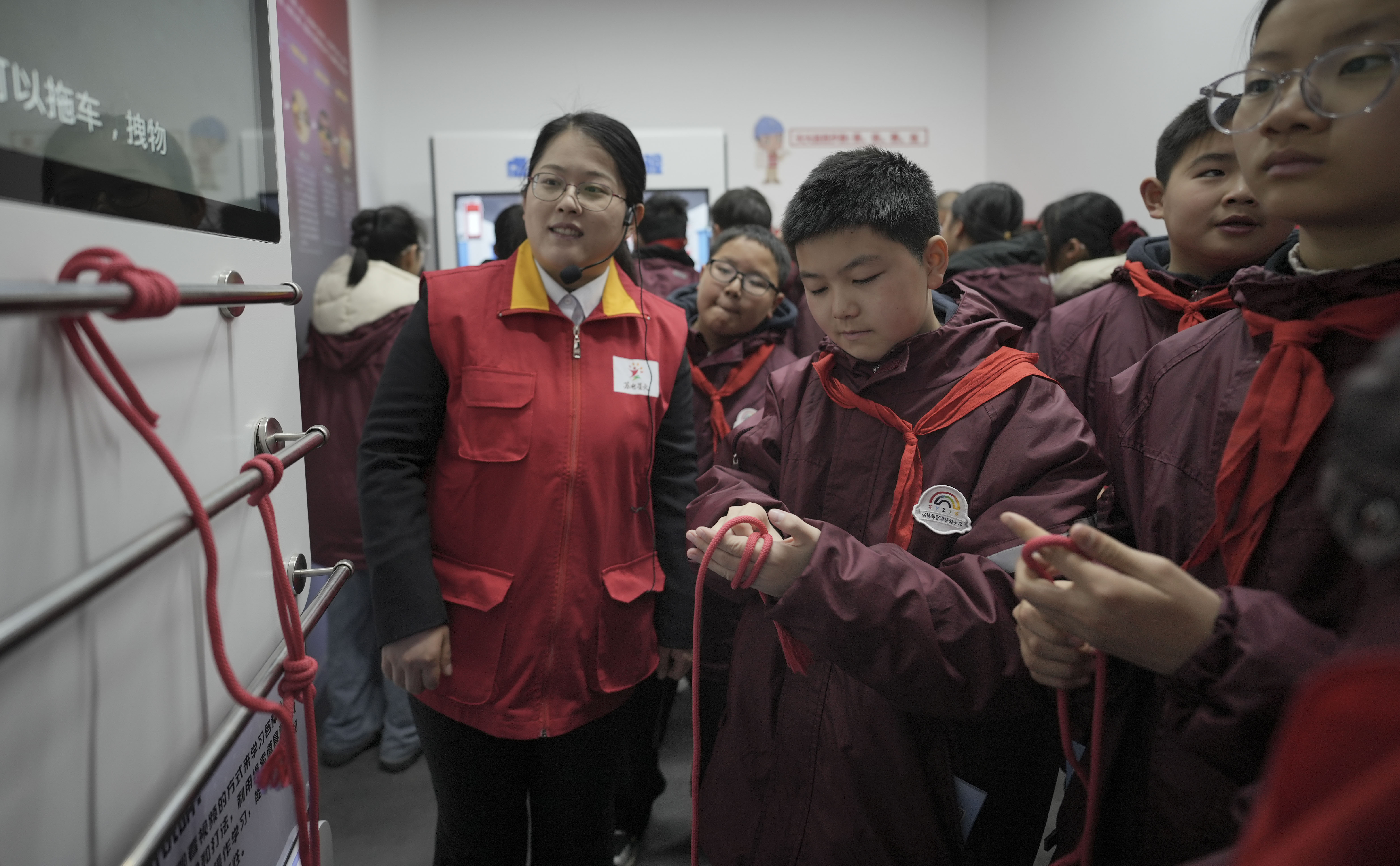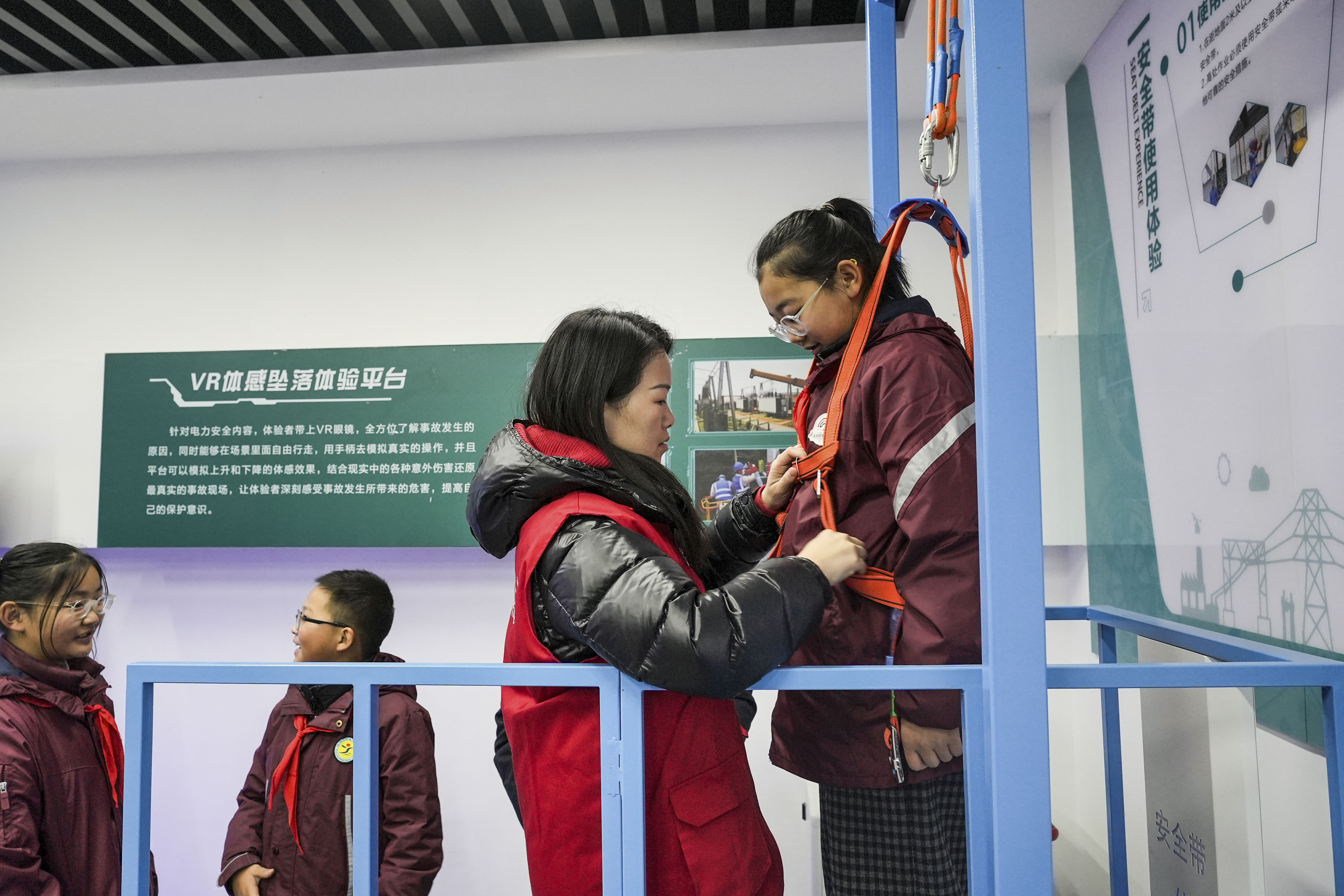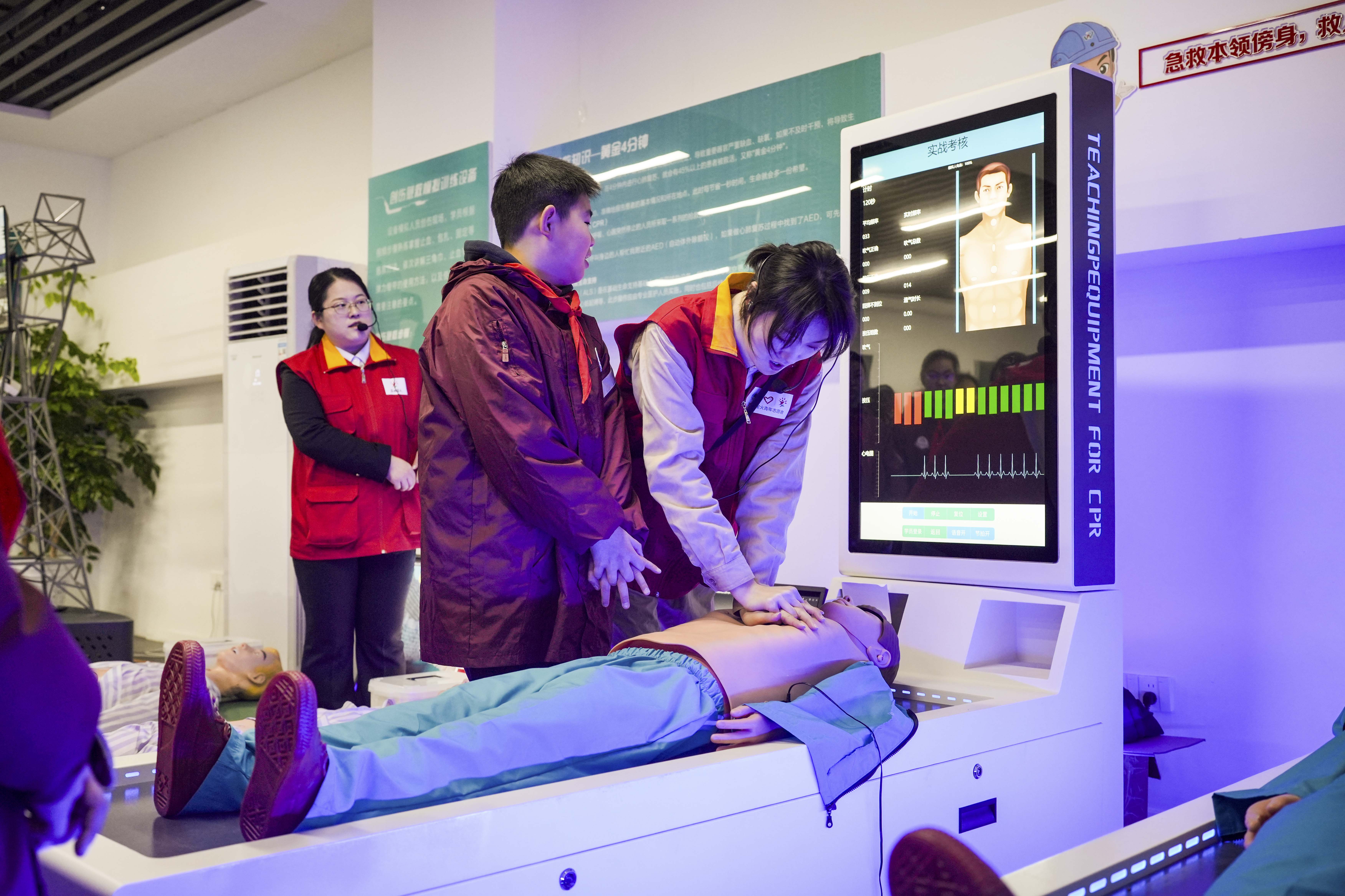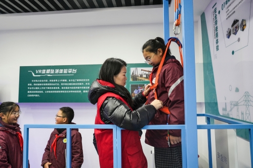 在电力科普教育基地安全演练区,志愿者们向宿豫张家港小学学生传授应急防护知识。在触电急救体验区,队员借助心肺复苏模拟人讲解关键要点并指导实操;在VR体感坠落体验平台,学生佩戴VR眼镜模拟电力高空作业坠落场景。此外,还在相关训练区结合常见意外伤害场景,教授学生创伤急救、应急结绳等技能,实现安全知识向实操能力的转化。