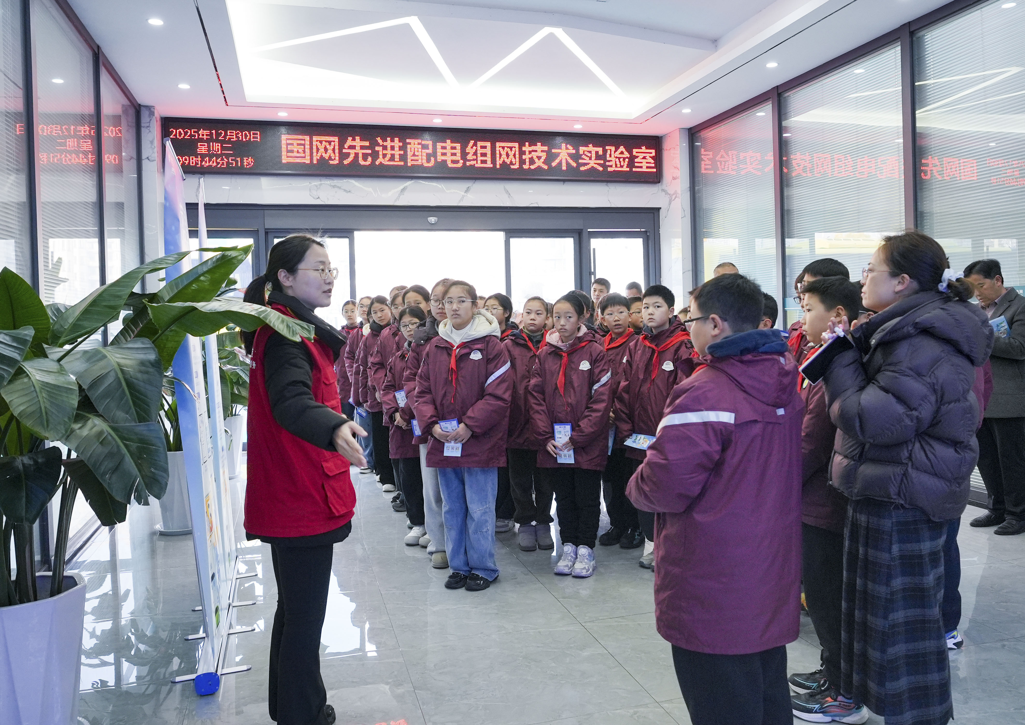 2025年12月30日,省电机工程学会电力科普教育基地——国网宿迁供电公司智能配电网新技术研究与应用实验室为宿豫张家港实验小学的同学们开启了一场“解锁安全码 成长有盔甲”的沉浸式电力研学之旅。此次研学将课堂搬进电力科普教育基地,让孩子们在实景化、互动化体验中探索电力奥秘,筑牢安全用电、绿色用电理念。