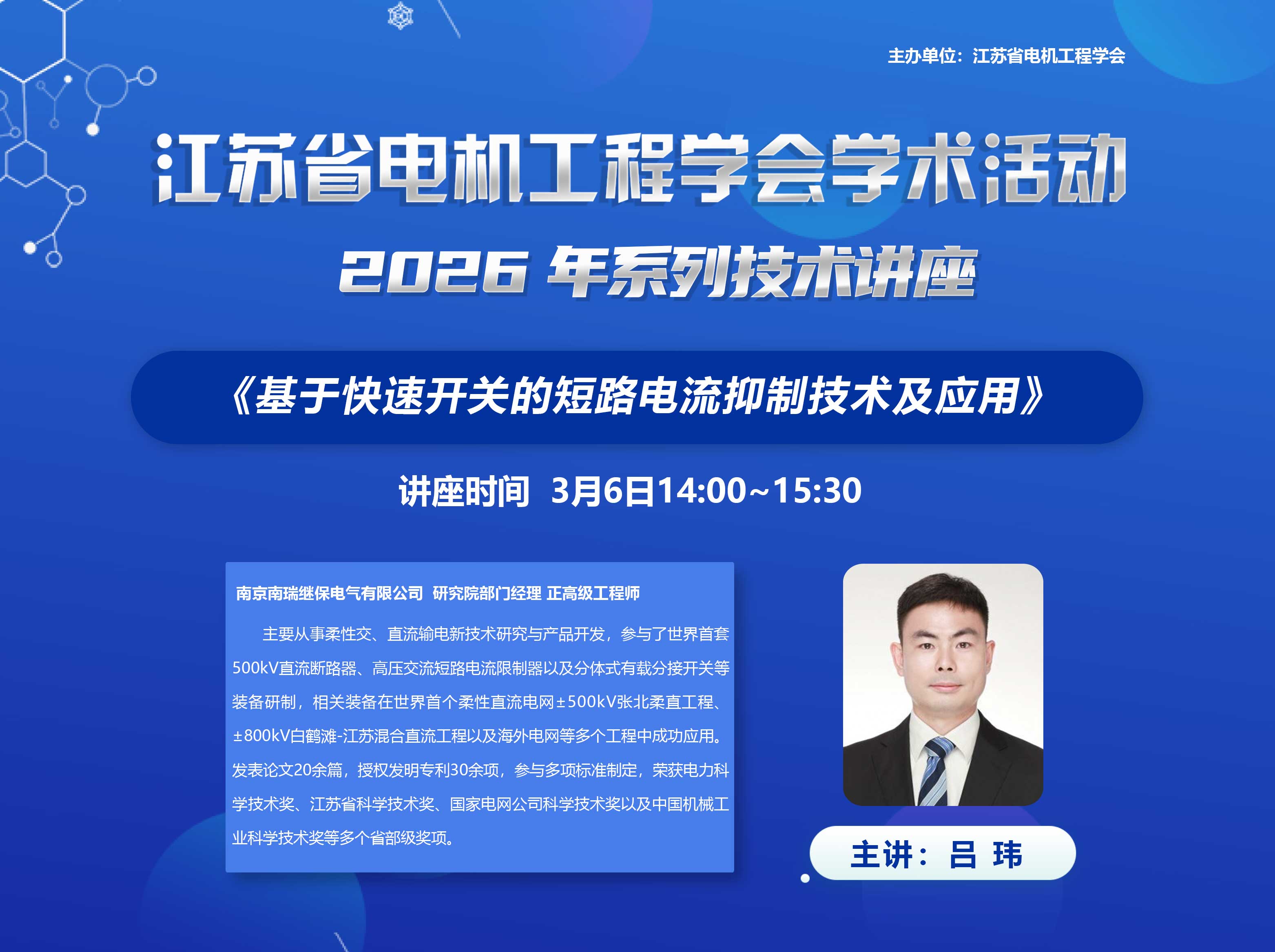 3月6日,省电机工程学会成功举办2026年第1期线上讲座。讲座邀请南京南瑞继保电气有限公司研究院经理吕玮作《基于快速开关的短路电流抑制技术及应用》报告。学会各会员单位、相关专委会及省内外电力能源领域专业人员800余人在线观看了本次讲座。