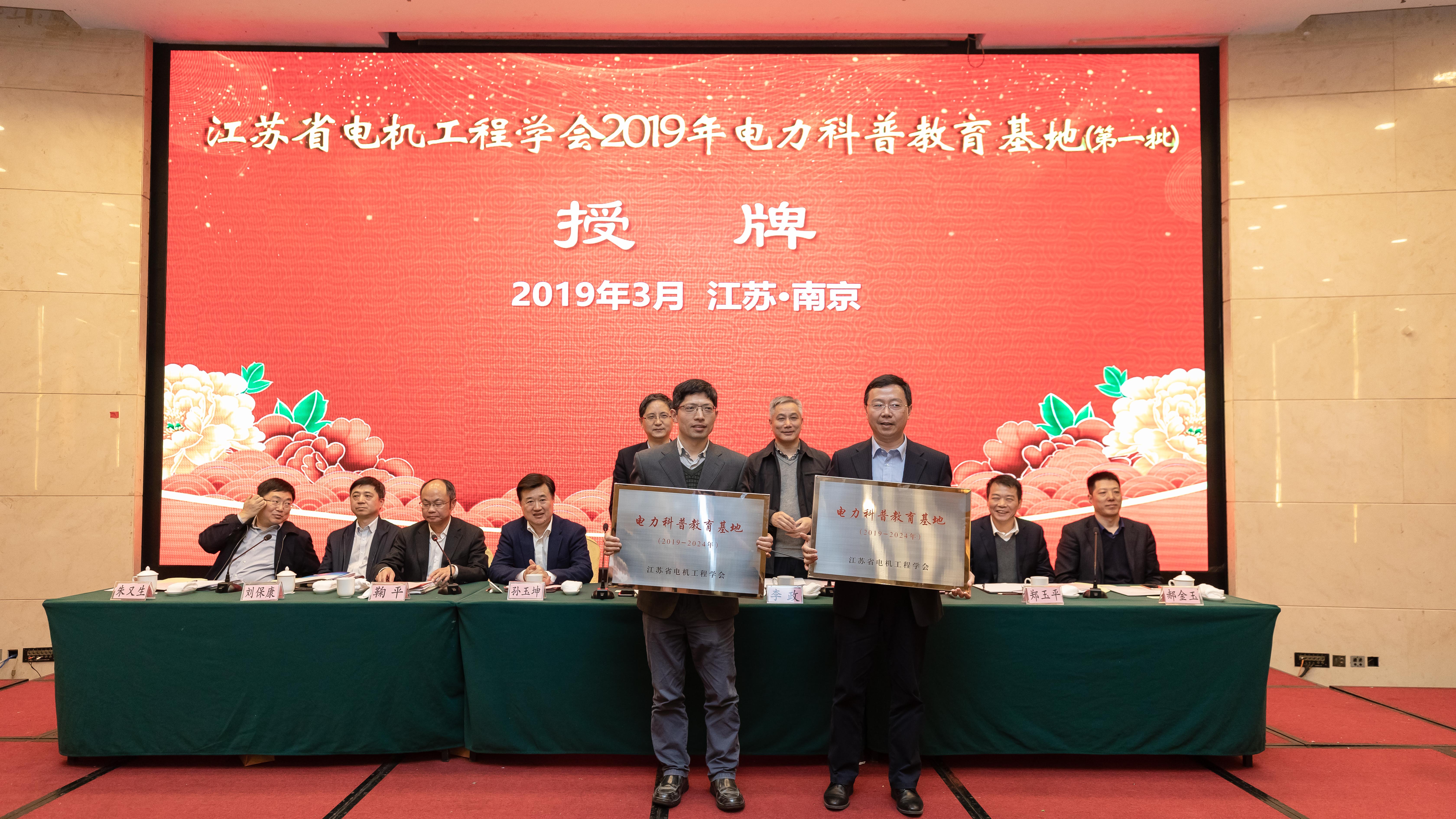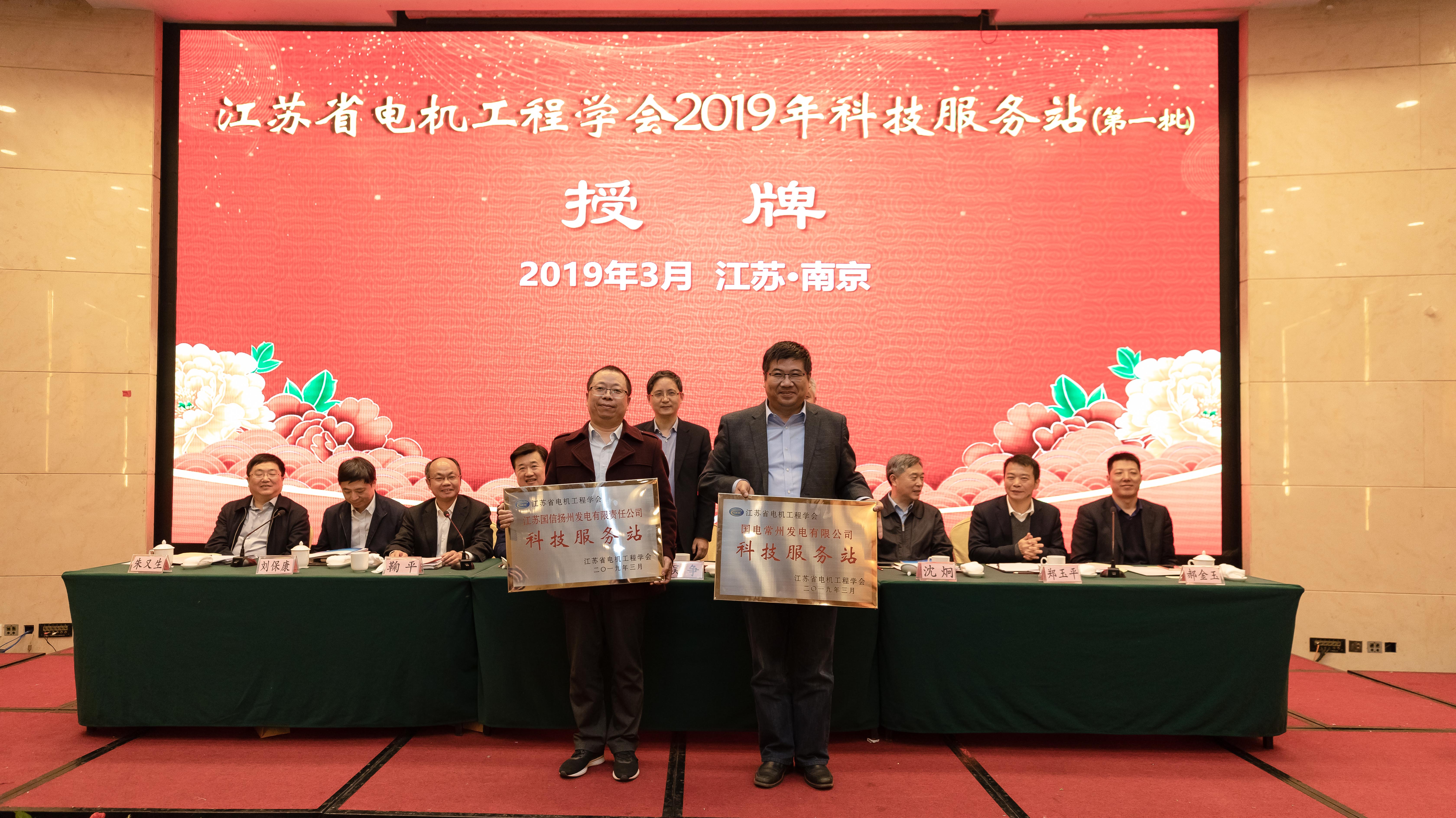 3月27日,江苏省电机工程学会第十届理事会第三次会议暨2019年工作会议在南京召开。会上,对省电机工程学会认定的2019年第一批科技服务站--江苏国信扬州发电有限责任公司科技服务站和国电常州发电有限公司科技服务站进行了授牌。会议还为省电机工程学会新命名的2019年第一批电力科普教育基地--国网江苏省电力有限公司苏州供电分公司“同里综合能源服务中心”和 江苏国信溧阳抽水蓄能发电有限公司“江苏溧阳抽水蓄能电站”举行授牌仪式。省电机工程学会理事长、国网江苏省电力有限公司总工程师吴争,省科协学会学术部部长李政共同为科技服务站和电力科普基地授牌。