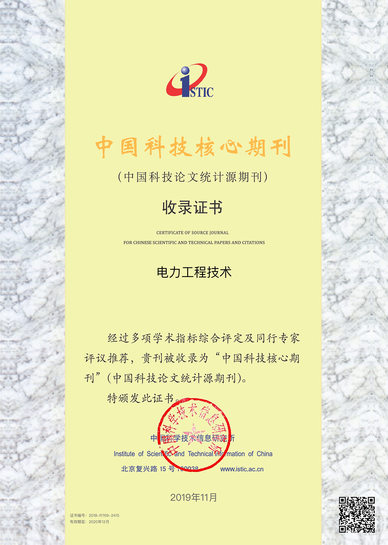 11月19日,中国科技论文统计结果发布会在北京国际会议中心召开。会上,中国科学技术信息研究所发布了《2019年版中国科技期刊引证报告(核心版)》。继2018年首次入选后,由国网江苏省电力有限公司、江苏省电机工程学会主办《电力工程技术》2019年继续被收录为中国科技核心期刊(中国科技论文统计源期刊)。