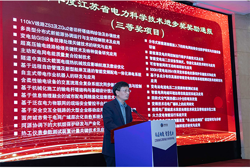学会常务理事兼常务副秘书长李群宣读《江苏省电机工程学会关于授予2019年度江苏省电力科学技术进步奖的通报》和《江苏省电机工程学会关于2019年度江苏省电力年度科技人物奖的奖励通报》。