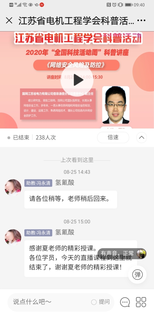 8月25日下午,江苏省电机工程学会举办2020年“全国科技活动周”系列科普讲座——《网络安全风险及防控》。本次讲座采用网络直播方式进行,专门邀请国家电网公司蓝队指挥官、国网江苏信通公司副主任夏飞主讲。省电机工程学会各会员单位、专工委会230余人在线观看了本次讲座。