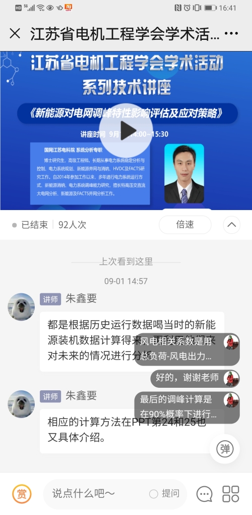 9月1日下午,江苏省电机工程学会成功举办系列技术讲座第四期——《新能源对电网调峰特性影响评估及应对策略》。讲座采用网络直播的方式进行,特邀国网江苏电科院系统及新能源技术中心朱鑫要博士主讲。省电机工程学会各会员单位、专工委会、学生分会90余名代表在线观看了讲座。