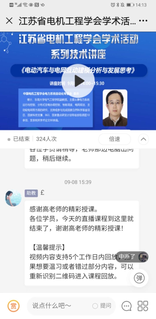 9月8日下午,江苏省电机工程学会成功举办系列技术讲座第六期——《电动汽车与电网互动建模分析与发展思考》。讲座采用网络直播的方式进行,特邀东南大学电气工程学院副教授高山主讲。省电机工程学会各会员单位、专工委会、学生分会320余名代表在线观看了本次讲座。