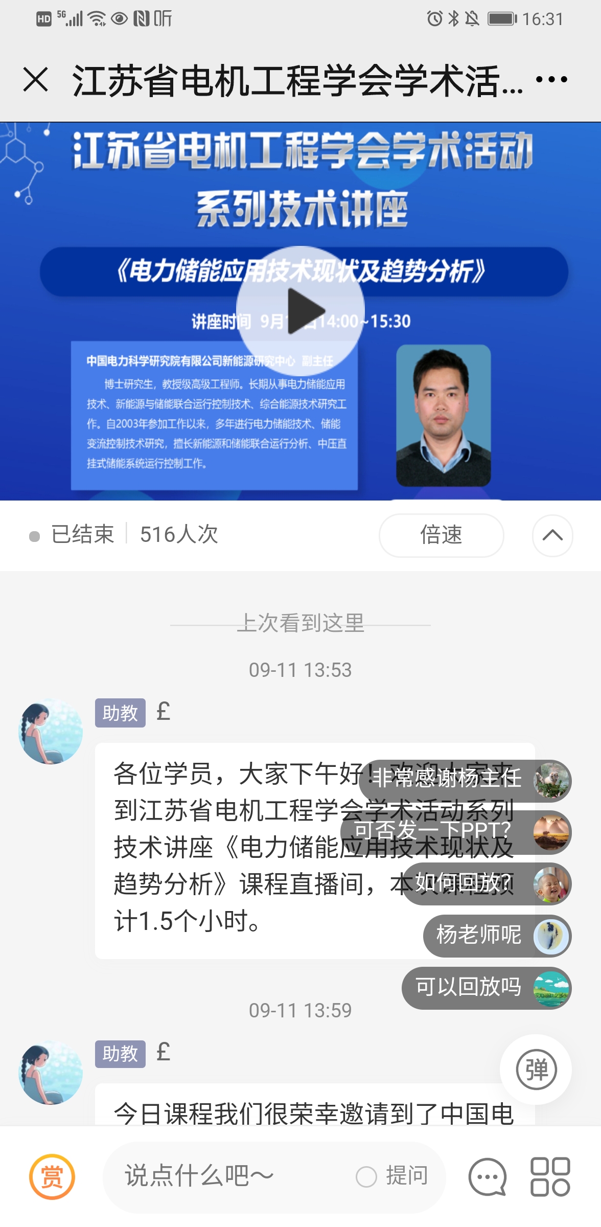9月11日下午,江苏省电机工程学会成功举办系列技术讲座第七期——《电力储能应用技术现状及趋势分析》。讲座采用网络直播的方式进行,特邀中国电力科学研究院有限公司新能源研究中心副主任、教授级高工杨波主讲。省电机工程学会各会员单位、专工委会、学生分会500余名代表在线观看了本次讲座。
