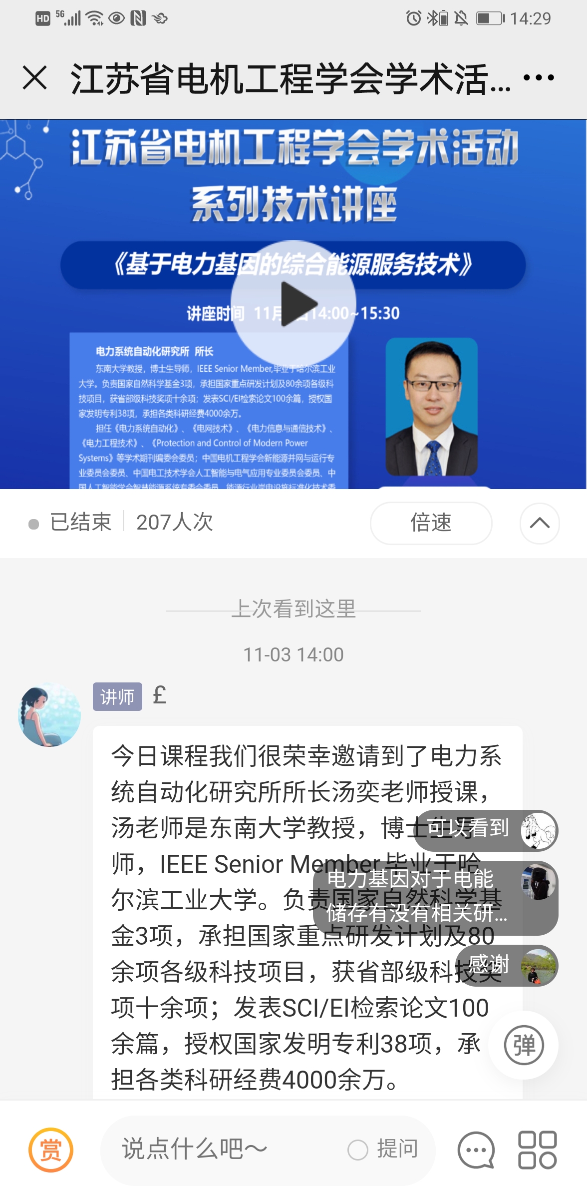 11月3日下午,江苏省电机工程学会成功举办系列技术讲座——《基于电力基因的综合能源服务技术》。讲座采用网络直播的方式进行,特邀东南大学教授、博士生导师、电力系统自动化研究所所长汤奕主讲。省电机工程学会各会员单位、专工委会、学生分会200余人次在线观看了本次讲座。