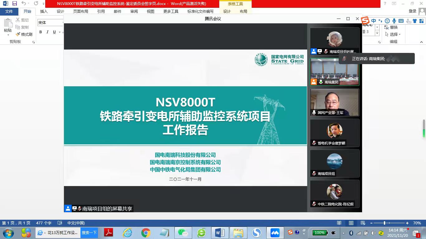 11月20日,江苏省电机工程学会受国电南瑞科技股份有限公司、国电南瑞南京控制系统有限公司、中国中铁电气化局集团有限公司委托,主持召开了“NSV8000T铁路牵引变电所辅助监控系统”科技成果鉴定会。鉴定会采用视频会议方式举行。此次鉴定委员会成员由来自国家电网总部、铁路局、高校、铁路设计院和铁路建设集团等单位的专家组成。