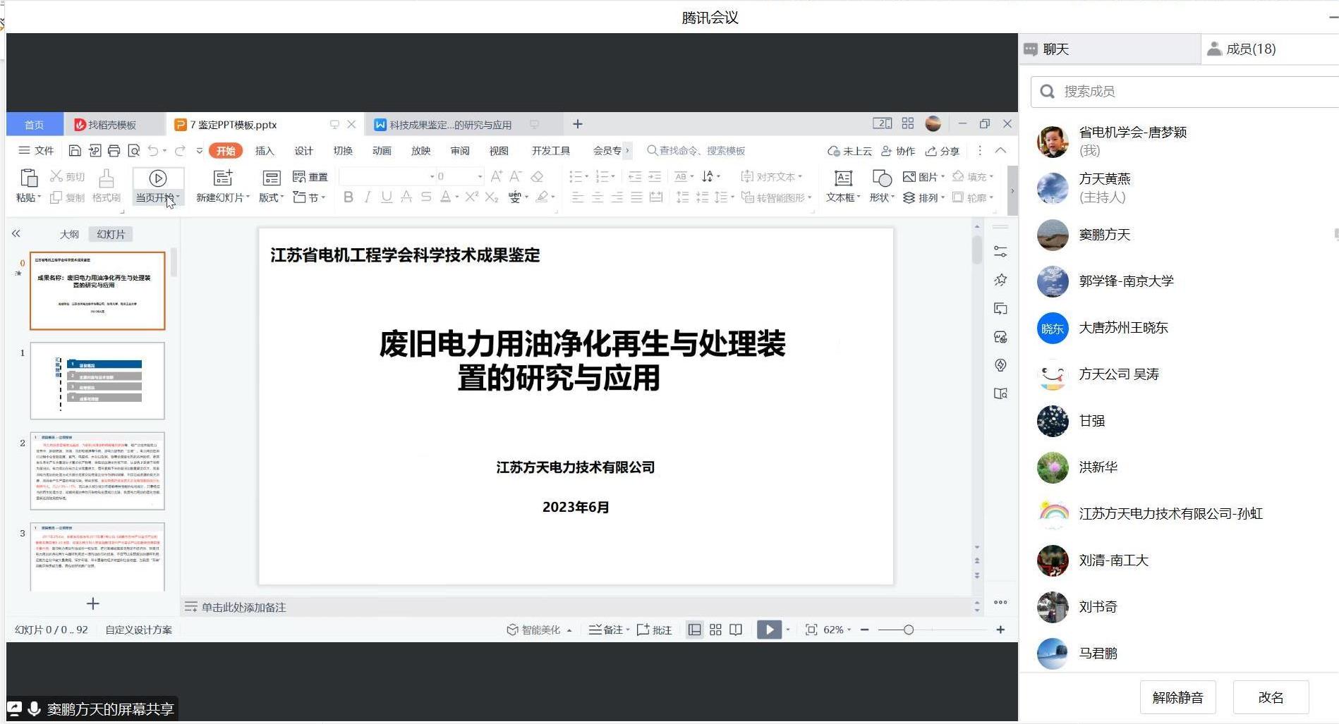 6月1日,江苏省电机工程学会受江苏方天电力技术有限公司委托,采用线上方式主持召开“废旧电力用油净化再生与处理装置的研究与应用”项目科技成果鉴定会。本次鉴定委员会由来自南京大学、国网江苏省电力有限公司超高压分公司、河北省水利水电勘测设计研究院集团有限公司、中电华创电力技术研究有限公司、南京理工大学、中水北方勘测设计研究院有限责任公司和大唐苏州热电有限责任公司等单位专家组成。