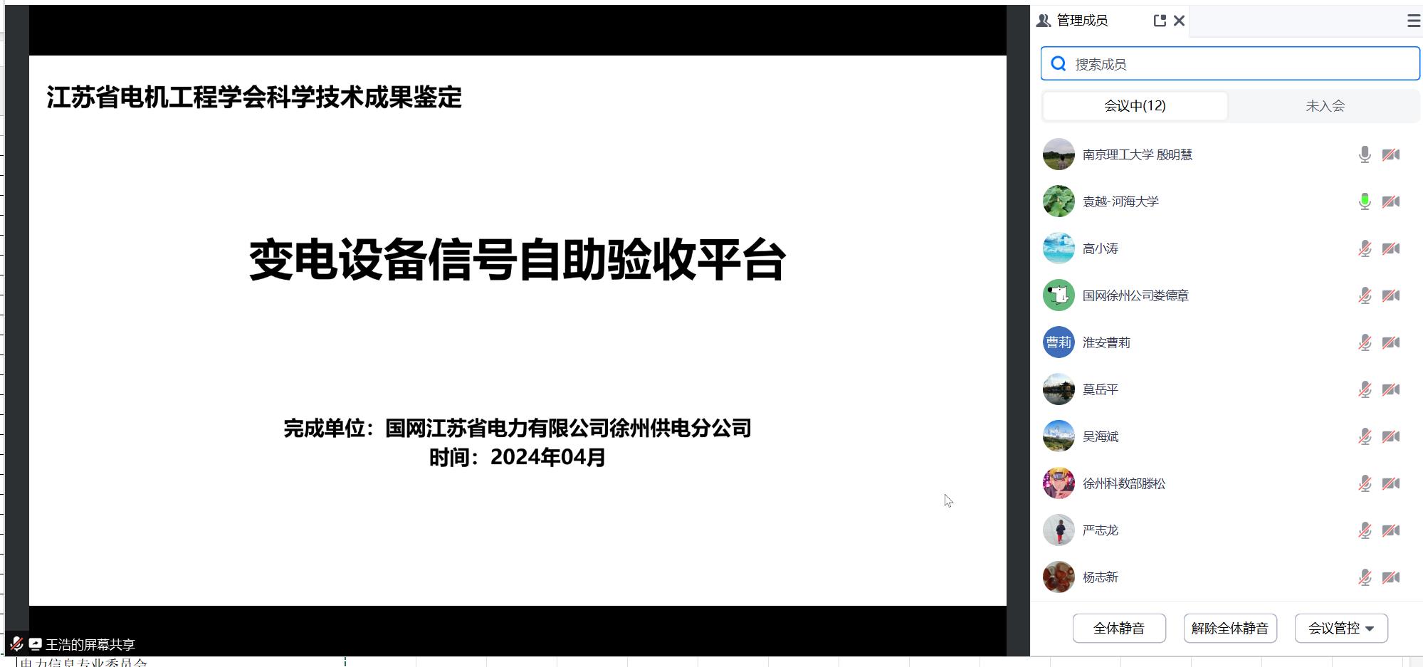 4月13日,江苏省电机工程学会受国网徐州供电公司委托,以视频会议方式主持召开了“变电设备信号自助验收平台”项目科技成果鉴定会。本次鉴定委员会由来自河海大学、国网江苏省电力有限公司信息通信分公司、国网江苏省电力有限公司电力科学研究院、扬州大学、南京理工大学、国网淮安供电公司、国网常州供电公司等单位专家组成。