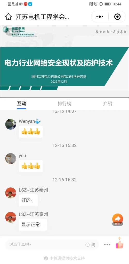 12月16日下午,江苏省电机工程学会成功举办2022年“电力之光”科普讲座第十二期——《电力行业网络安全现状及防护技术》。讲座采用网络直播的方式进行,特邀国网江苏省电力有限公司电力科学研究院网络安全技术研究专职姜海涛高工主讲。省电机工程学会各会员单位、专工委会、学生分会以及省内有关电力能源企业相关专业人员50余位在线观看或回看了本次讲座。