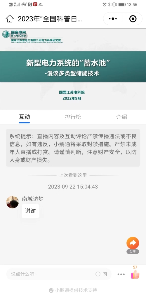 9月22日下午,江苏省电机工程学会成功举办2023年“全国科普日”线上讲座。讲座邀请江苏省首席科技传播专家、国网江苏电科院配电网技术中心主任高级工程师史明明博士作《新型电力系统的“蓄水池”-漫谈多类型储能技术》报告。省电机工程学会各会员单位、专工委会、学生分会以及省内有关电力能源企业相关专业人员150余人次在线观看了本次讲座。