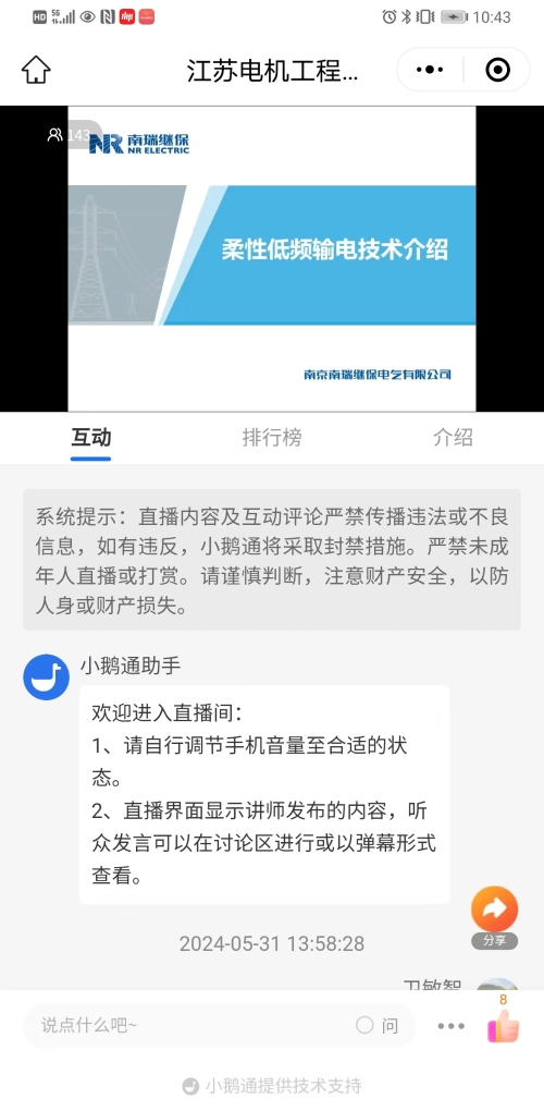 5月31日下午,江苏省电机工程学会成功举办2024年“全国科技活动周”线上科普讲座。讲座邀请南京南瑞继保电气有限公司邱德锋高工作《柔性低频输电技术介绍》报告。省电机工程学会各会员单位、专工委会、学生分会以及省内有关电力能源企业相关专业人员140余人次在线观看了本次讲座。