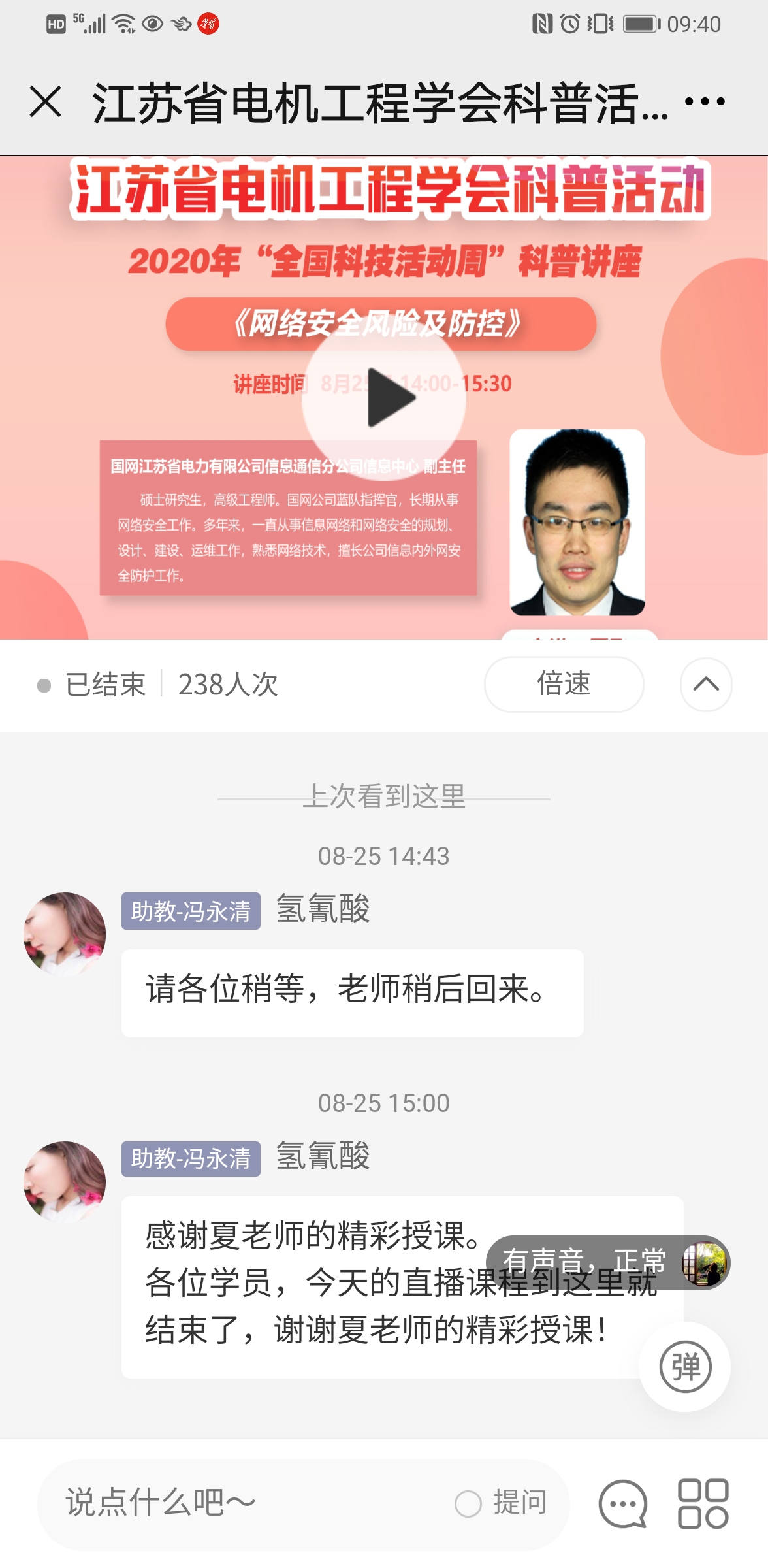 8月25日下午,江苏省电机工程学会举办2020年“全国科技活动周”系列科普讲座——《网络安全风险及防控》。本次讲座采用网络直播方式进行,专门邀请国家电网公司蓝队指挥官、国网江苏信通公司副主任夏飞主讲。省电机工程学会各会员单位、专工委会230余人在线观看了本次讲座。