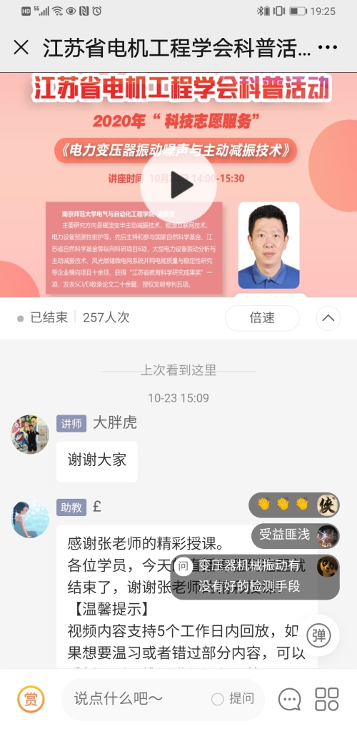 10月23日下午,江苏省电机工程学会成功举办2020年“科技志愿服务”科普讲座——《电力变压器振动噪声与主动减振技术》。讲座采用网络直播的方式进行,特邀南京师范大学电气与自动化工程学院副教授张海龙博士主讲。省电机工程学会各会员单位、专工委会、学生分会250余人次在线观看了本次讲座。