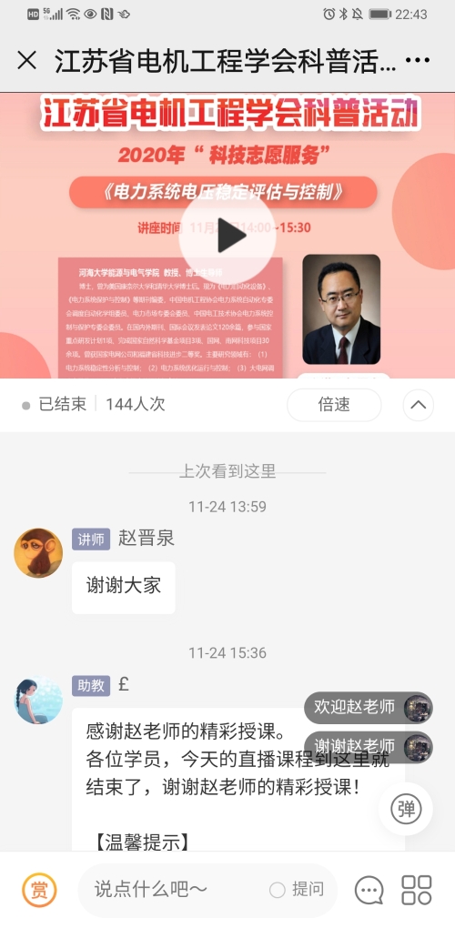 11月24日下午,江苏省电机工程学会成功举办2020年“科技志愿服务”系列科普讲座——《电力系统电压稳定评估与控制》。讲座采用网络直播方式进行,特邀河海大学能源与电气学院赵晋泉教授主讲。省电机工程学会各会员单位、专工委会、学生分会140余人在线观看了本次讲座。
