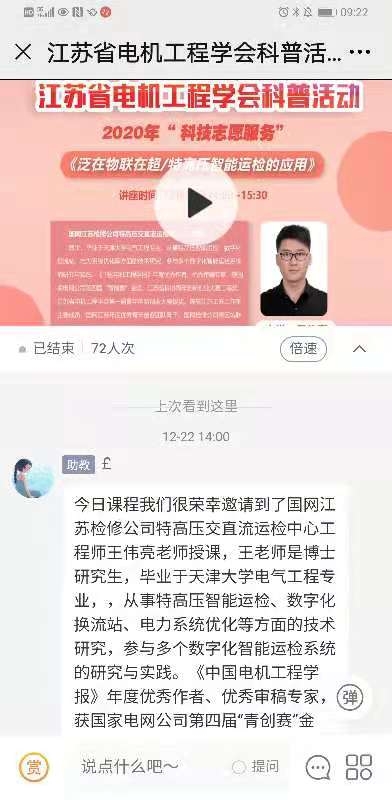 12月22日下午,江苏省电机工程学会成功举办2020年“科技志愿服务”科普讲座——《泛在物联在超/特高压智能运检的应用》。讲座采用网络直播方式进行,特邀国网江苏检修分公司王伟亮博士主讲。省电机工程学会各会员单位、专工委会、学生分会70余人在线观看了本次讲座。