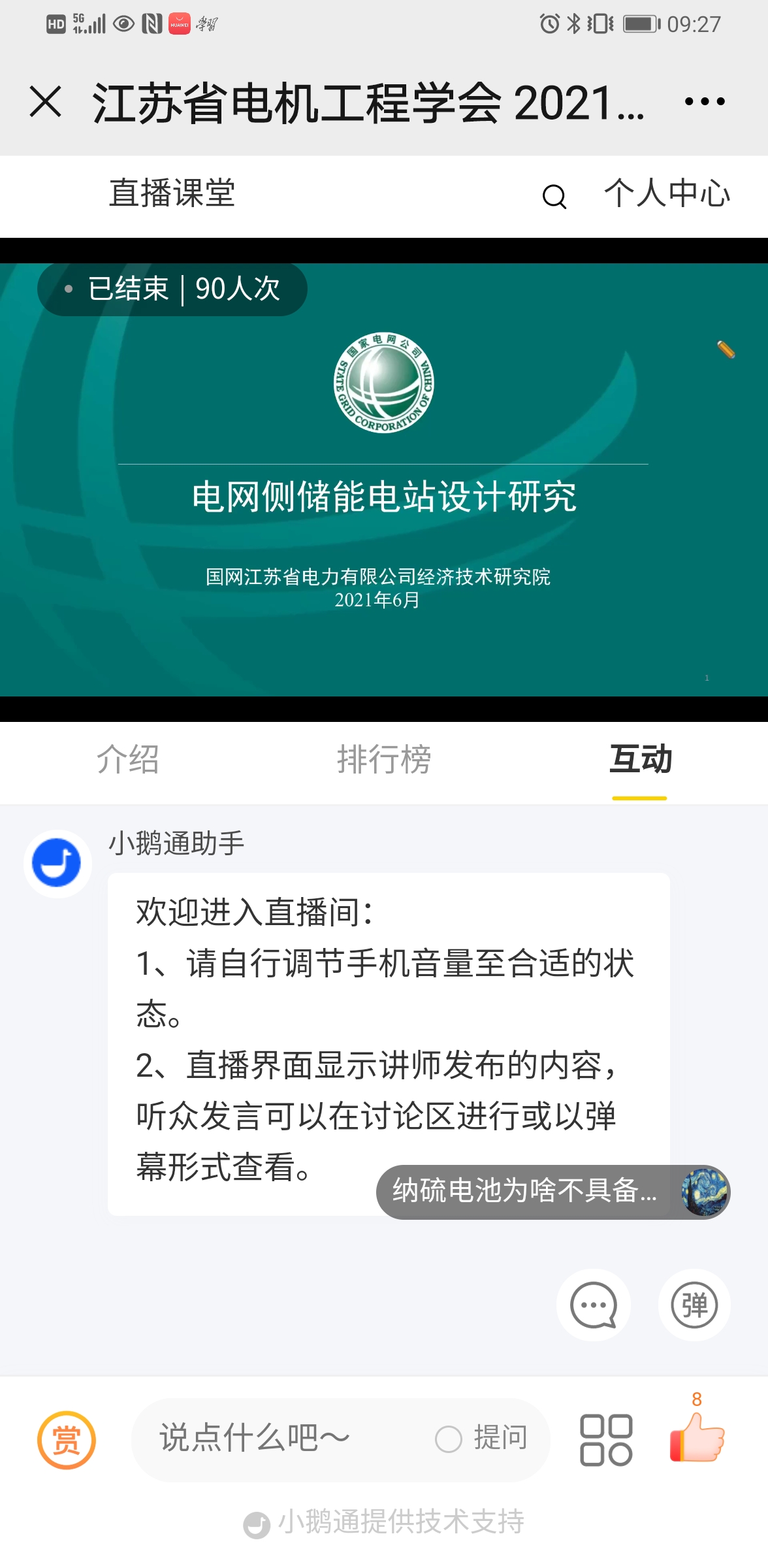 6月25日下午,江苏省电机工程学会举办2021年“全国科技工作者日”科普讲座——《电网侧储能电站设计研究》。本次讲座采用网络直播方式进行,邀请国网江苏经研院变电专职范逸斐主讲。省电机工程学会各会员单位、专工委会、学生分会及省内电力企业共1300余人次在线观看了本次讲座。