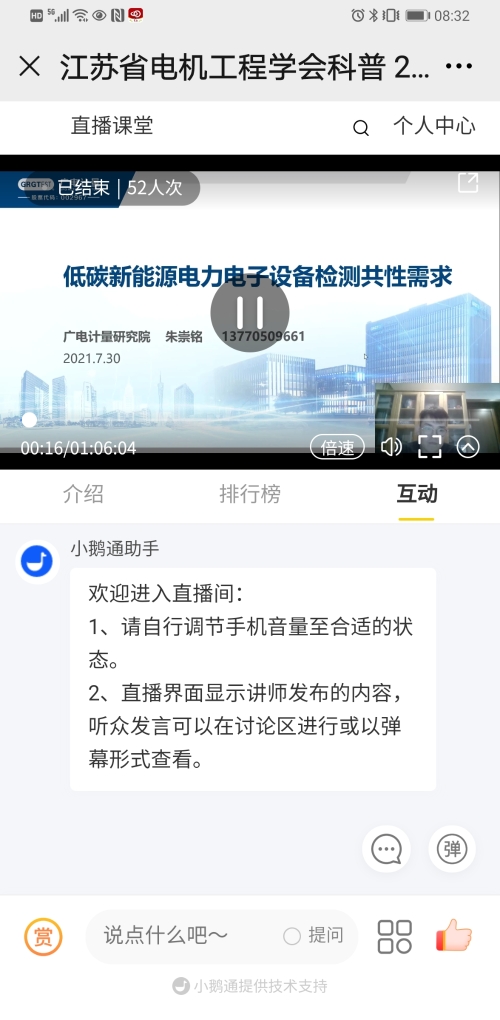 7月30日下午,江苏省电机工程学会举办2021年“科技志愿服务”科普讲座——《低碳新能源电力电子设备检测共性需求》。本次讲座采用网络直播方式进行,邀请广电计量研究院朱崇铭研究员主讲。省电机工程学会各会员单位、专工委会、学生分会及省内电力企业共260余人次在线观看了本次讲座。