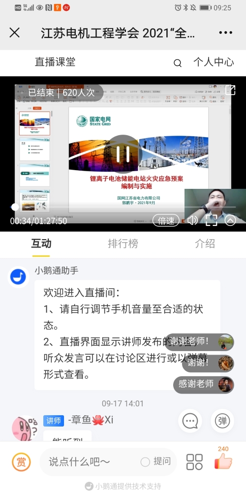 9月17日下午,江苏省电机工程学会举办2021年“全国科普日”科普讲座——《锂离子电池储能电站火灾应急预案编制与实施》。本次讲座采用网络直播方式进行,邀请国网江苏省电力有限公司安全监察部郭鹏宇高工主讲。省电机工程学会各会员单位、专工委会、学生分会及省内电力企业共1220余人次在线观看或回看了本次讲座。