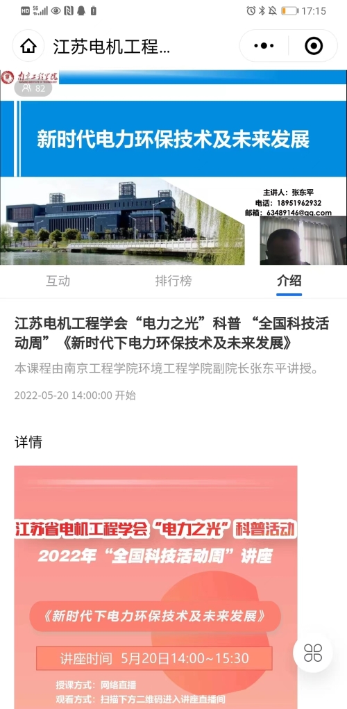 5月20日下午,江苏省电机工程学会成功举办2022年“电力之光”科普讲座第三期暨2022年“全国科技活动周”讲座——《新时代下电力环保技术及未来发展》。讲座采用网络直播的方式进行,特邀南京工程学院环境工程学院副院长张东平教授主讲。省电机工程学会各会员单位、专工委会、学生分会80余人在线观看或回看了本次讲座。