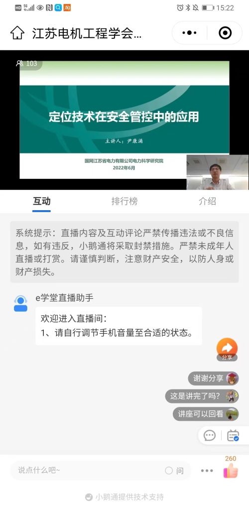 6月24日下午,江苏省电机工程学会成功举办2022年“电力之光”科普讲座第五期——《定位技术在安全管控中的应用》。讲座采用网络直播的方式进行,特邀国网江苏电科院安全技术中心尹康涌高工主讲。省电机工程学会各会员单位、专工委会、学生分会100余人在线观看或回看了本次讲座。