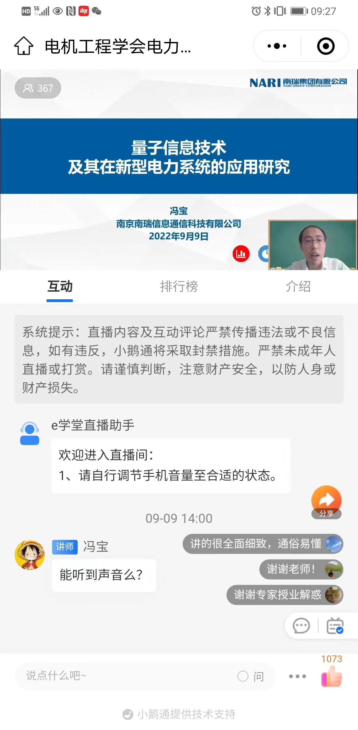 9月9日下午,在2022年“全国科普日”来临之际,江苏省电机工程学会举办2022年“电力之光”科普讲座第八期——《量子信息技术及其在新型电力系统的应用研究》。讲座采用网络直播的方式进行,特邀南京南瑞信息通信科技有限公司量子产品线负责人、南瑞集团三级业务专家冯宝高工作主讲。省电机工程学会各会员单位、专工委会、学生分会以及省内有关电力能源企业相关专业人员360余人次在线观看或回看了本次讲座。